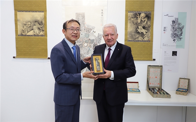 布达佩斯中国文化中心主任金浩向匈牙利国会副主席雅高布·伊什特万赠送礼物